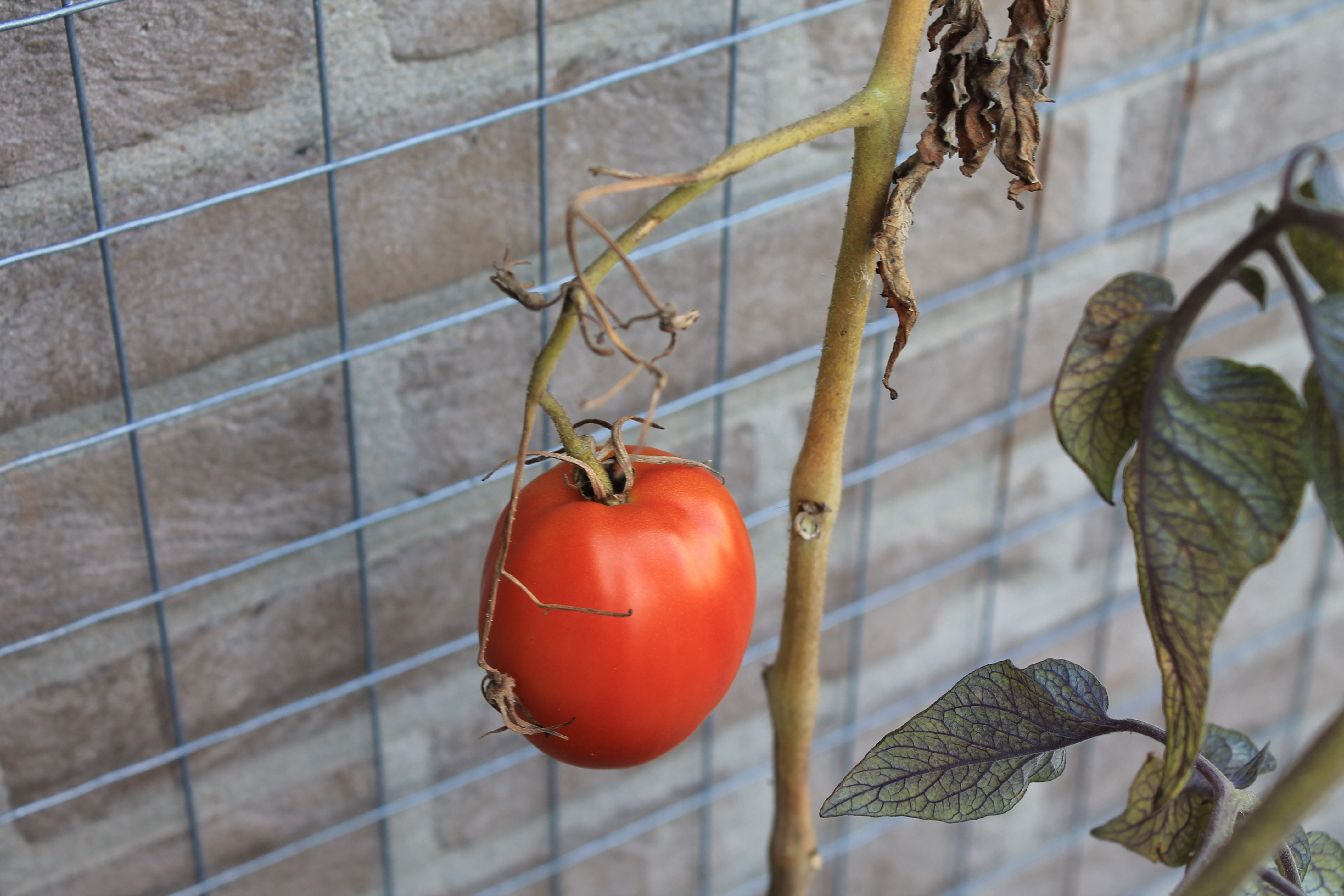 Ik oogstte vandaag ook één tomaat, en daar zal het waarschijnlijk bij blijven, want ik zie de vier kleine groene exemplaren die nu nog aan de plant hangen niet zonder Phytophthora af te rijpen. Allemaal het gevolg van de veel te natte zomer natuurlijk.