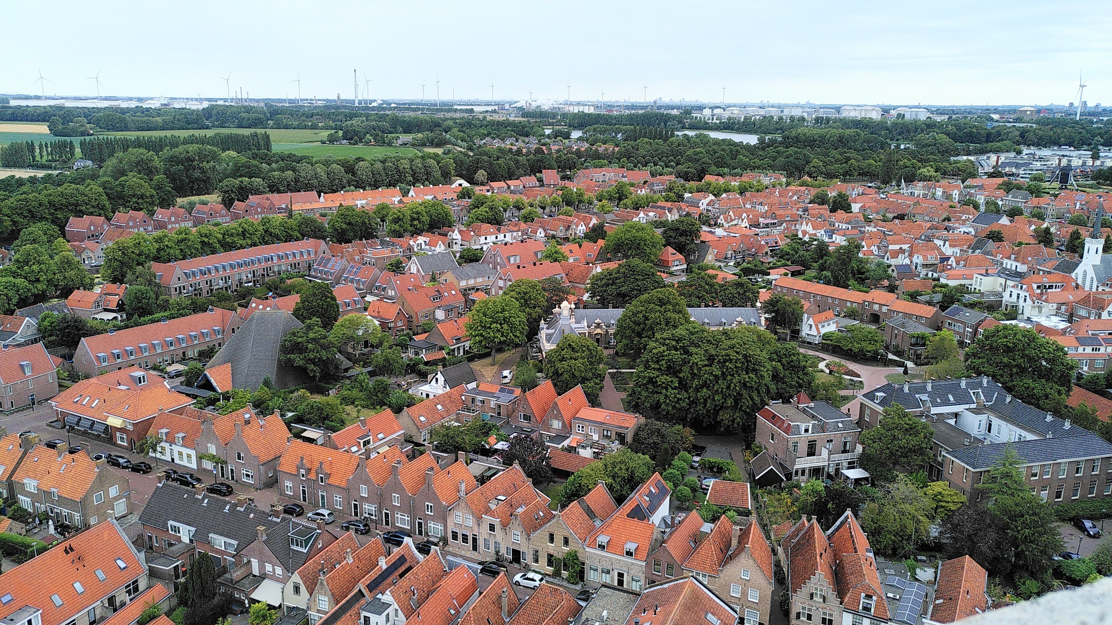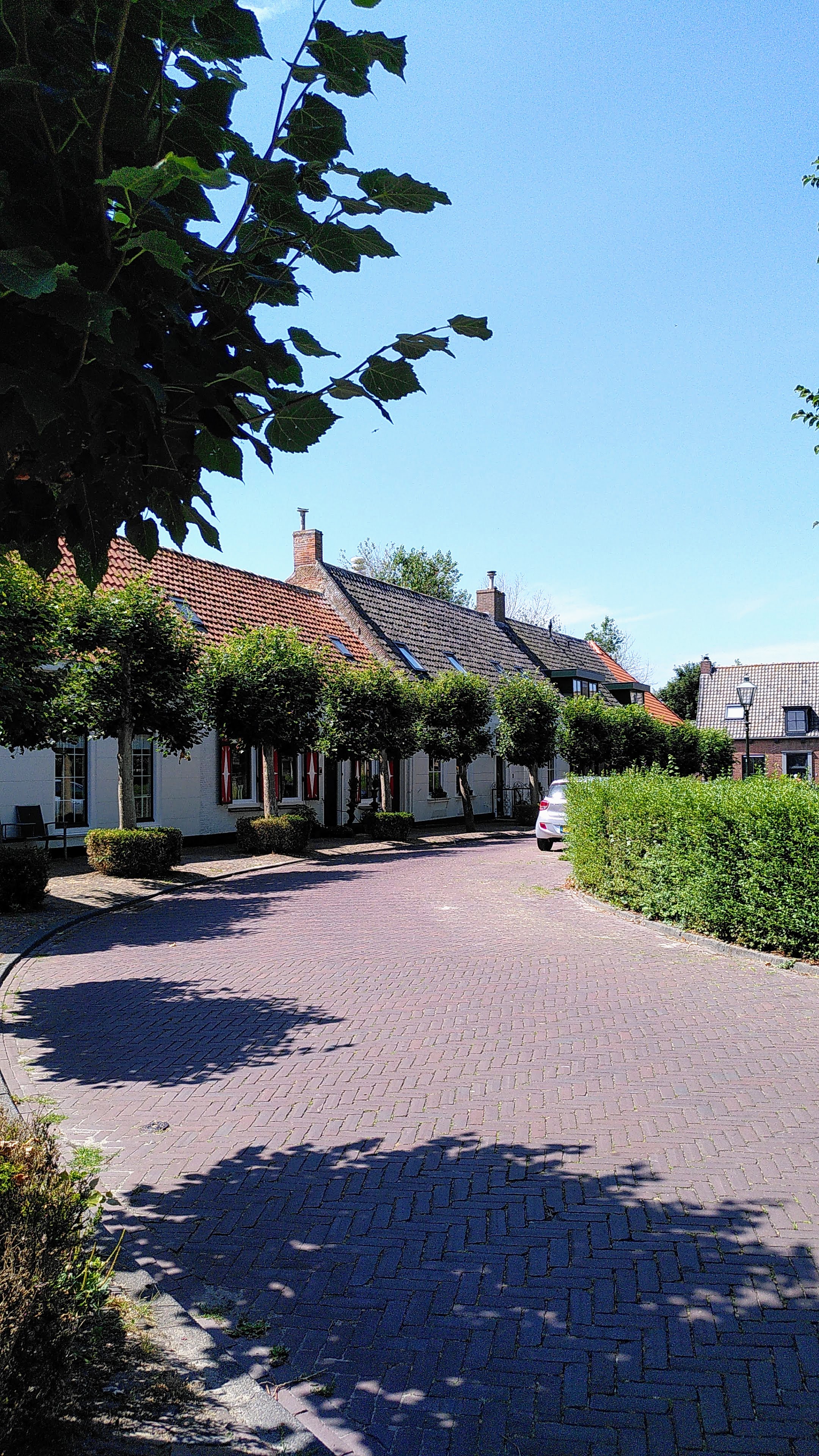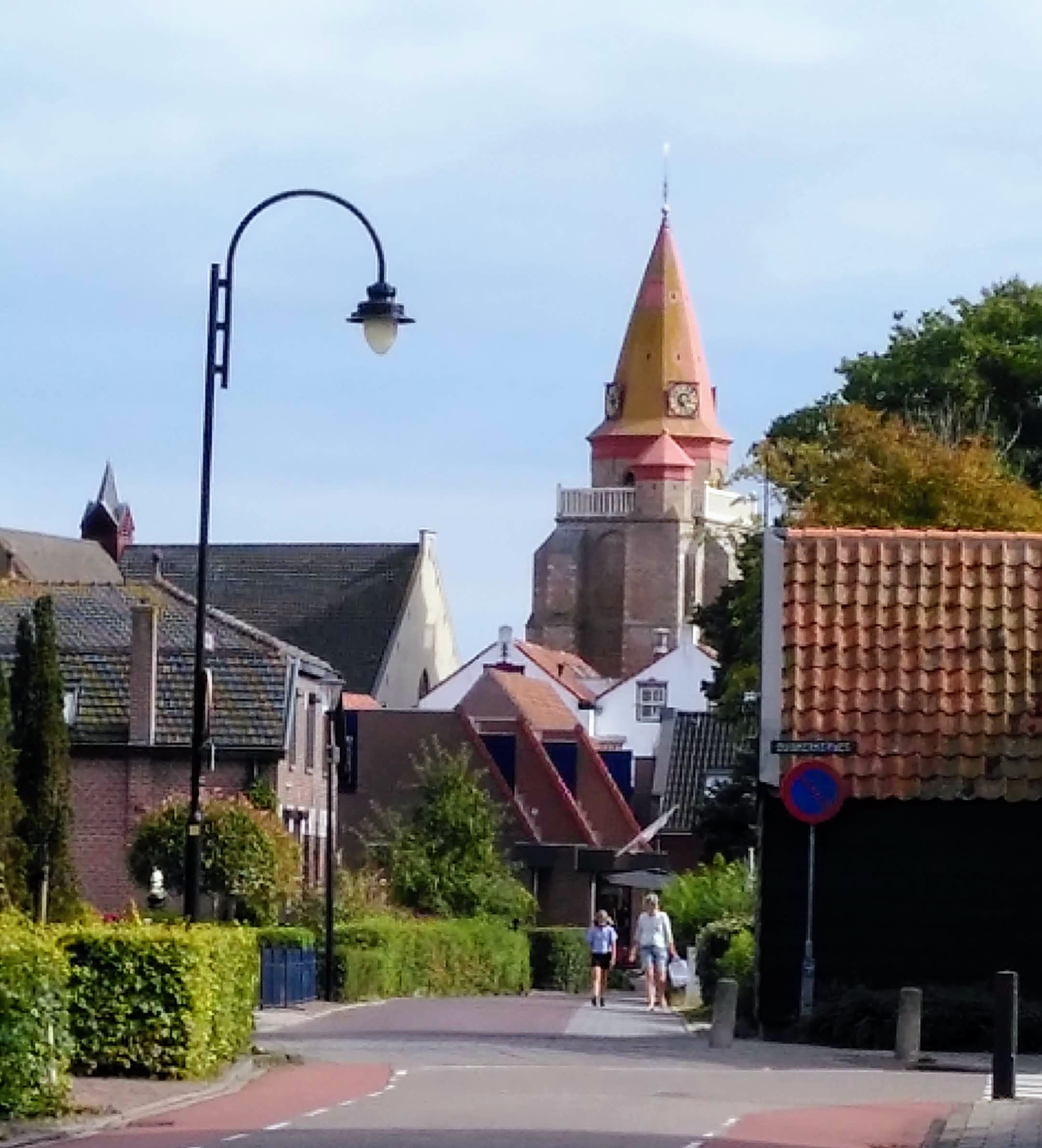 Op Google Maps had ik gezien dat Brielle een stadje was met stervormige vesting, daar wou ik dus wel eens passeren. De indrukwekkende kerktoren zou mij misschien zicht geven op die vestingen, dus ging ik richting kerk. Aan de zijkant mijn fiets parkerend keek ik nieuwsgierig door een zijraam naar wat ik dacht dat een tearoom was. Een dame kwam naar buiten en vroeg me binnen in ‘De Huiskamer’ een plek waar je voor een halve euro een kop koffie of thee krijgt en daarbovenop een babbel. Ik kreeg als eerste vraag of mijn man daarboven was (de kerktoren), ik repliceerde met nee maar wel anders. Men informeerde naar mijn reisweg, waar ik overnachtte, en één van de heren bood me spontaan een bed aan in zijn huisje aan zee. Niks me-too, gewoon heel grappig! Ik vraag me af wat hij had gezegd mocht ik er op in gegaan zijn :-). Ik liet er €2 achter, ik kreeg immers ook een plakje vieze hotelcake bij de koffie en het gezelschap wou ook op mijn fietstrolley letten (de fietszak met de meest waardevolle dingen in waaronder de reserve fietsbatterij van Bruno nam ik standaard van de fiets als ik ergens binnen ging), want ik ging nog naar boven (de toren), maar ik deed dat wel alleen.